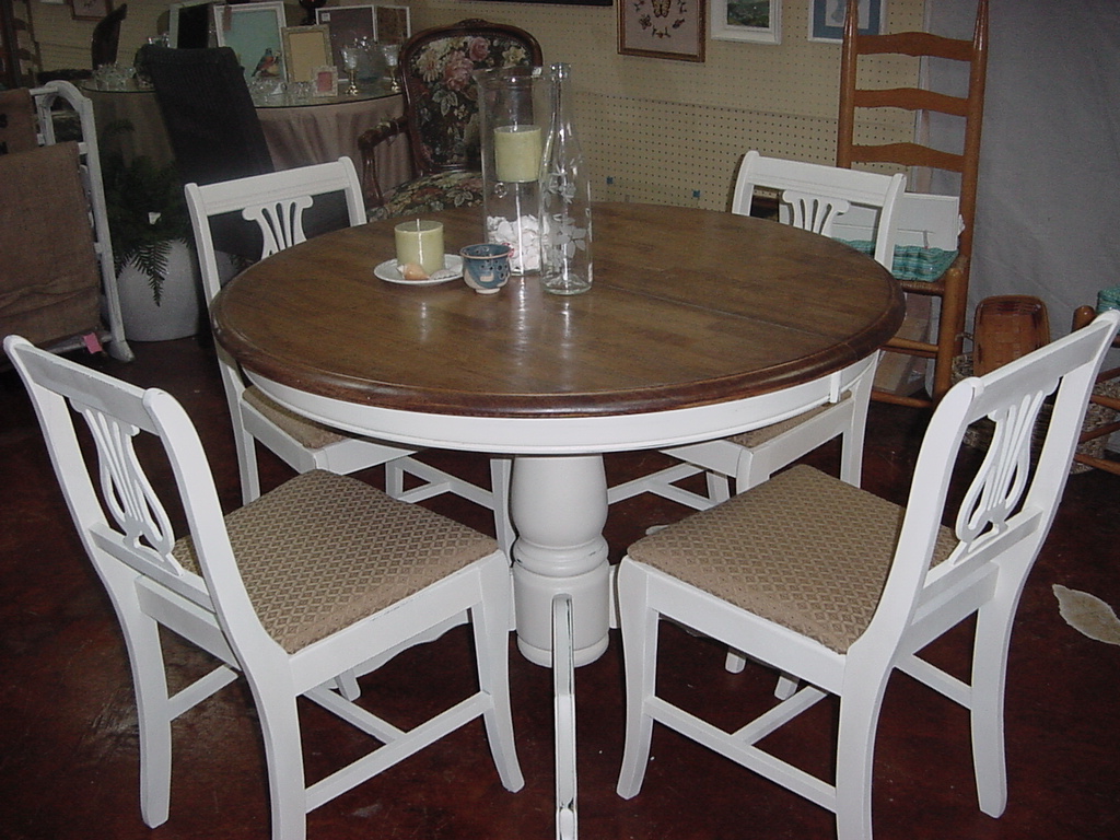 Meantime, we Added Chairs to the Stained Round Top Pedestal Table reported earlier. Here is the table with four chairs we matched up to it.