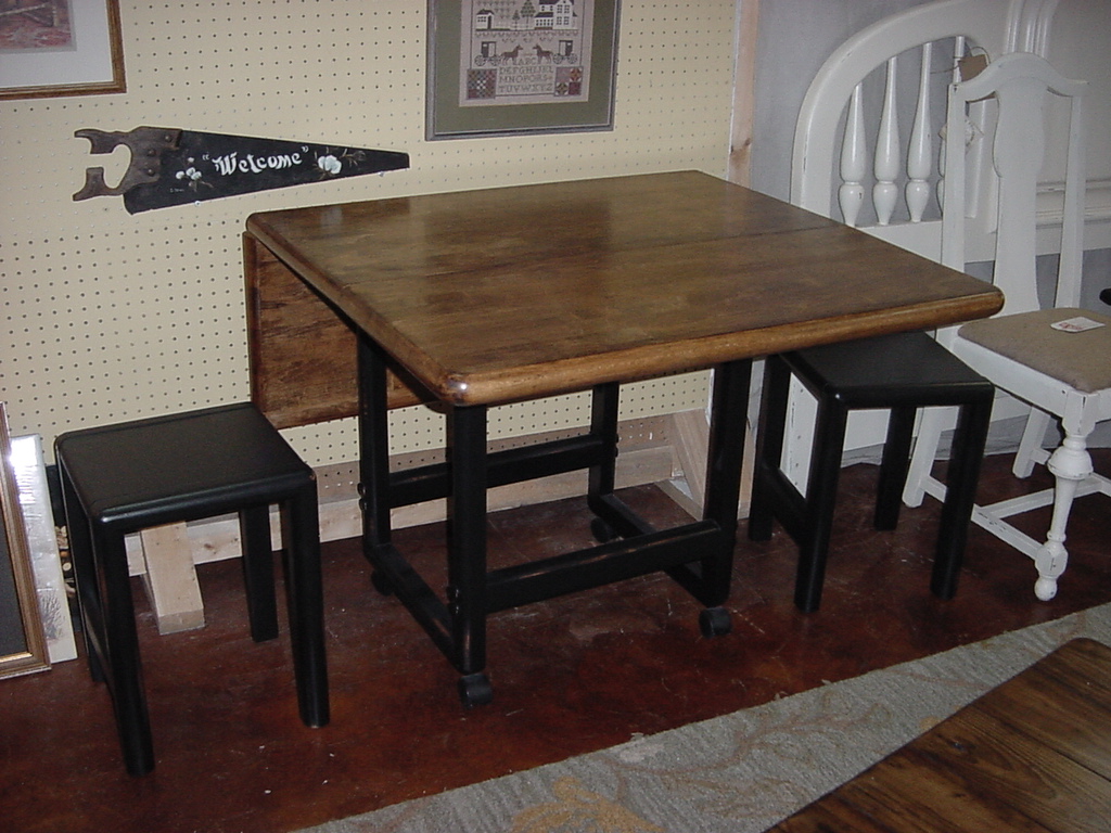 Just Fine Tables recently finished Refinishing and Up-styling a “Heavy Butcher Block Top” Drop Leaf Table and its two (2) Matching Stools while building a few custom tables. In addition to this drop leaf table having a one of a kind “Butcher Block” top, its legs are supported on casters to allow easy relocation (for example: cleaning underneath).