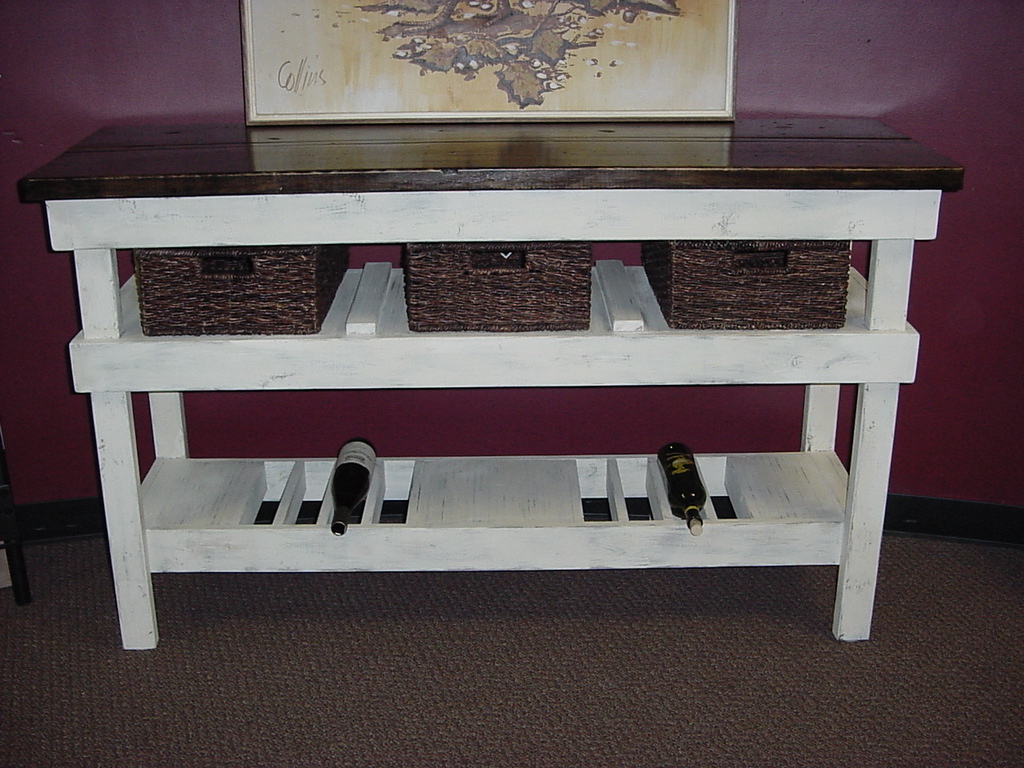 Below are pictures of a “Country Chic” Thick Pine Top FARM TABLE and a matching WINE BAR BUFFET TABLE that Just Fine Tables has hand built for one area family.