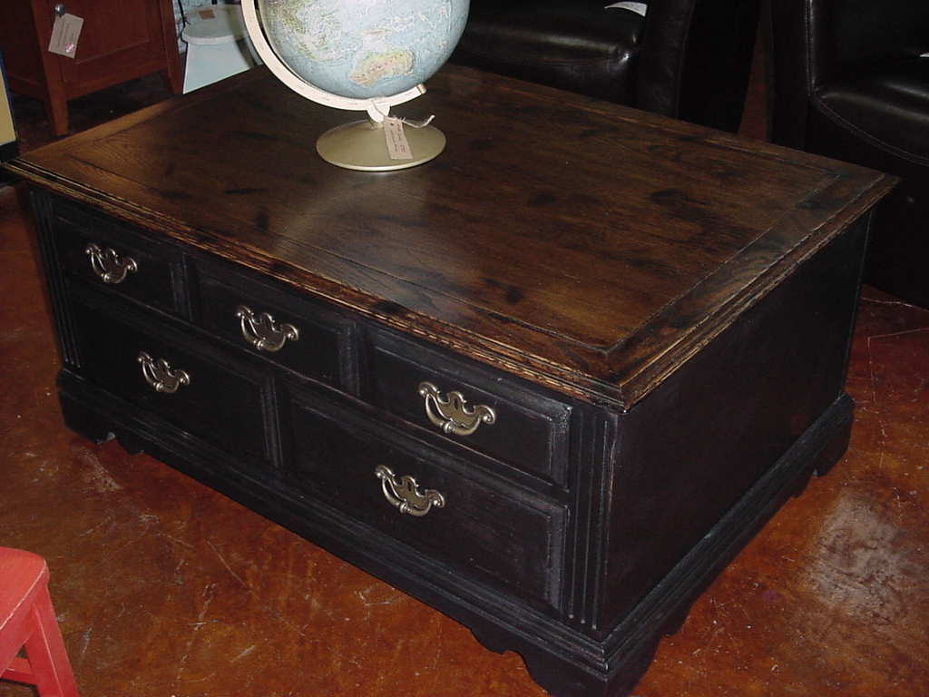 We replaced the old oak looking finish with a darker stained distressed top and the base has been painted black with light distressing to look more like our vintage Man Cave Coffee Tables of the past.