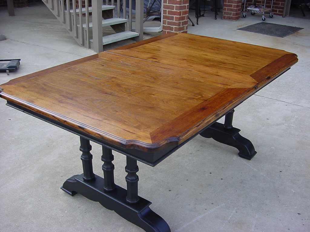 Just completed the refinishing of a Patterned Oak Veneer Top TRESTLE DINING TABLE that someone had given away. Anyway, it was easy to see that the table could be easily refinished and updated (my touch) to make a great dining table for a family needing a large dining table. The result is shown below: