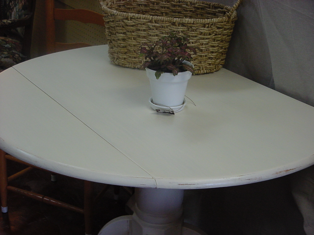 “””HOWEVER”””; a 42″ Stained Top Table with a Distressed Cottage White Pedestal Base is being delivered to ENCORE RESALES today (i.e. FATHER”S DAY). -Sorry no picture. Please visit Encore to see.