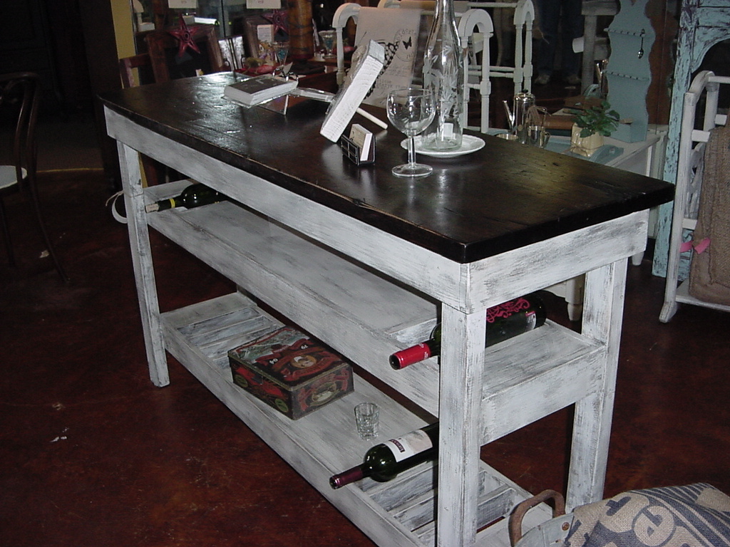 This Wine Bar-Buffet Table was built with a single plank top of thick poplar wood. It comes with two (2) built-in shelves and a total of 10 wine bottle storage.